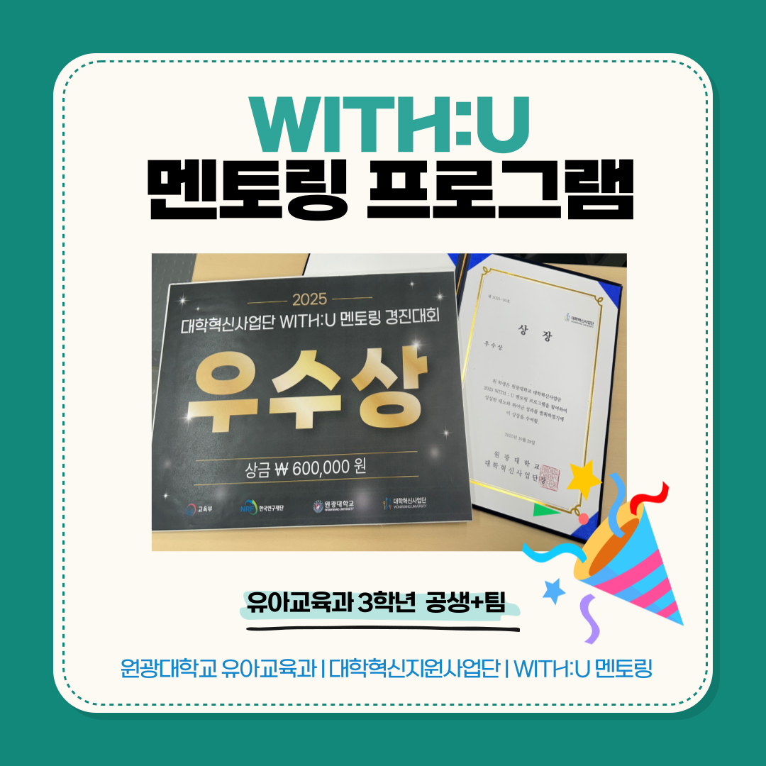 23학번 김O, 박O은, 양O정으로 구성된 공생 플러스팀이 대학혁신사업단이 주관하는 멘토링 사업에 참여하여 우수상을 수상하였습니다. 축하합니다!